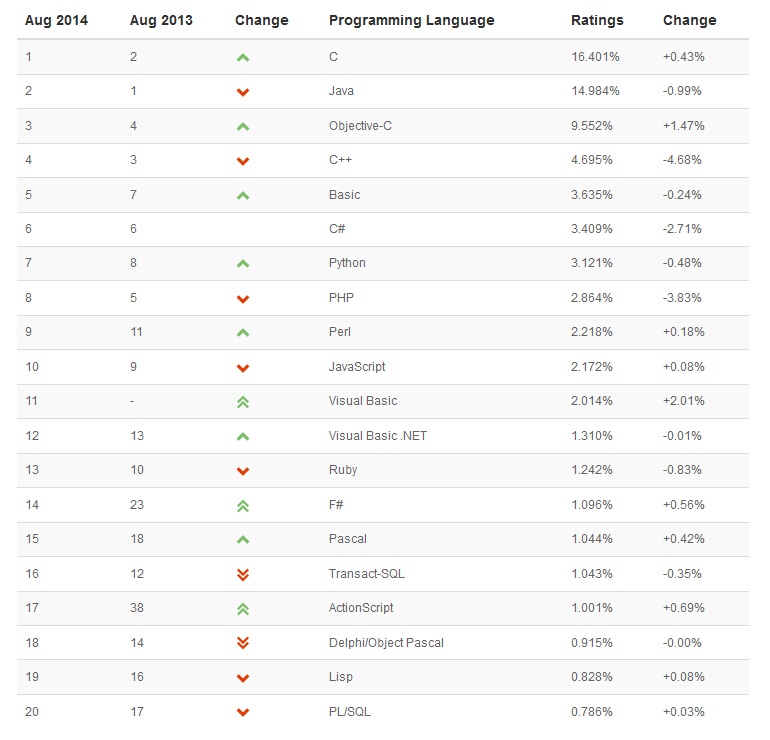 2014年8月编程语言排行榜 Swift掉出前20名
