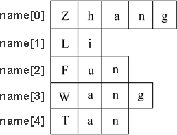 在定义字符串数组时怎样给数组分配存储空间呢?实际上,编译系统为每一个字符串变量分配4个字节,在这个存储单元中,并不是直接存放字符串本身,而是存放字符串的地址。在本例中,就是把字符串″Zhang″的地址存放在name[0],把字符串″Li″ 的地址存放在name[1],把字符串″Fun″的地址存放在name[2]……图5.11只是一个示意图。在字符串变量中存放的是字符串的指针(字符串的地址)。