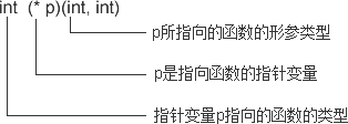 - int (*p)(int,int); //定义指向函数的指针变量p