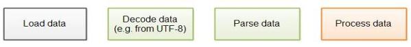 首先是数据从硬盘或者网络上装载。接着,解码数据,例如从UTF-8到UTF-16。第三步,解析数据。第四步,处理数据。