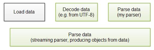 流式解析器总是能在所有数据装载进内存前开始解析数据。我的JSON解析器现在实现版本不能这样做。这意味着即使它在基础解析基准上更快,在现实运行的应用程序中,我的解析器必须等待数据装载,这将减慢整体的处理速度。如下图说明: